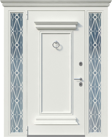 Белая дверь металлическая с ковкой и стеклом №6
