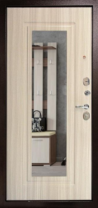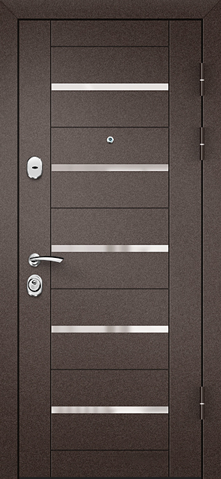 Прочный стальной каркас, лист металла толщиной 2 мм и система блокираторов делают эту модель надежным барьером для квартиры, офиса или частного дома. Внешняя поверхность покрыта молотковым напылением, устойчивым к механическим повреждениям и перепадам температуры, благодаря чему дверь сохраняет аккуратный вид долгие годы. Внутренняя накладка МДФ добавляет уюта и гармонично сочетается с интерьером прихожей. Зеркало на полотне выполняет не только декоративную функцию, но и делает пространство визуально шире. Зеленая входная дверь в квартиру №2 комплектуется двумя замками российских производителей — сувальдным Просам и цилиндровым Мосрентген, каждый из которых оснащён тремя ригелями. Два контура резинового уплотнения помогают минимизировать сквозняки и шум, а возможность выбрать сторону и тип открывания делает установку максимально удобной. При необходимости отделку, замки и дополнительные элементы можно адаптировать под индивидуальные требования. Зеленая входная дверь в квартиру №2 от производителя: быстрое изготовление и монтаж в Подольске, индивидуальные размеры, широкий выбор материалов и фурнитуры, официальная гарантия до 10 лет.