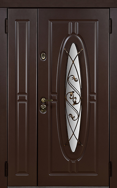 Двойная уличная дверь с овальным стеклом и художественной ковкой №14 — это уникальное сочетание функциональности и эстетики. Панели МДФ с ПВХ-покрытием, используемые как для внешней, так и для внутренней отделки, обладают высокой стойкостью к внешним воздействиям, сохраняя свой внешний вид на долгие годы. Внешний декор в виде художественной ковки придаёт двери особый шарм, подчеркивая её стиль и индивидуальность. Двойная уличная дверь с овальным стеклом и художественной ковкой №14 от производителя: быстрое изготовление и монтаж в Подольске, индивидуальные размеры, широкий выбор материалов и фурнитуры, официальная гарантия до 10 лет.