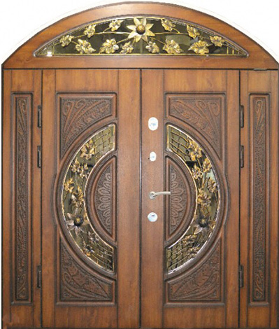 Дизайнерская входная дверь в частный дом с отделкой под дерево и решеткой №17