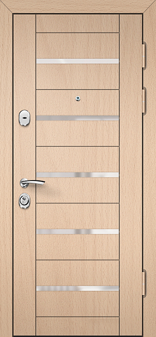 Эта бронированная дверь в современном дизайне №28 станет отличным решением для частного дома, квартиры или офиса, предлагая надежную защиту и стильный внешний вид. Ее конструкция включает каркас из профильной трубы 50х25 мм и металлическое полотно толщиной 2 мм, что обеспечивает прочность и долговечность. Внешняя и внутренняя отделка выполнены из плиты МДФ, придающей двери современный вид и стойкость к механическим повреждениям. Хотя терморазрыв отсутствует, конструкция с терморазрывом коробки и полотна помогает снижать теплопотери. Дополнительную безопасность обеспечивают два замка — сувальдный и цилиндровый, оба с тремя ригелями. В дверь можно добавить зеркало, стеклопакет или кованые элементы, а также установить видеодомофон, что делает эту модель максимально универсальной и индивидуальной. Бронированная дверь в современном дизайне №28 от производителя: быстрое изготовление и монтаж в Подольске, индивидуальные размеры, широкий выбор материалов и фурнитуры, официальная гарантия до 10 лет.